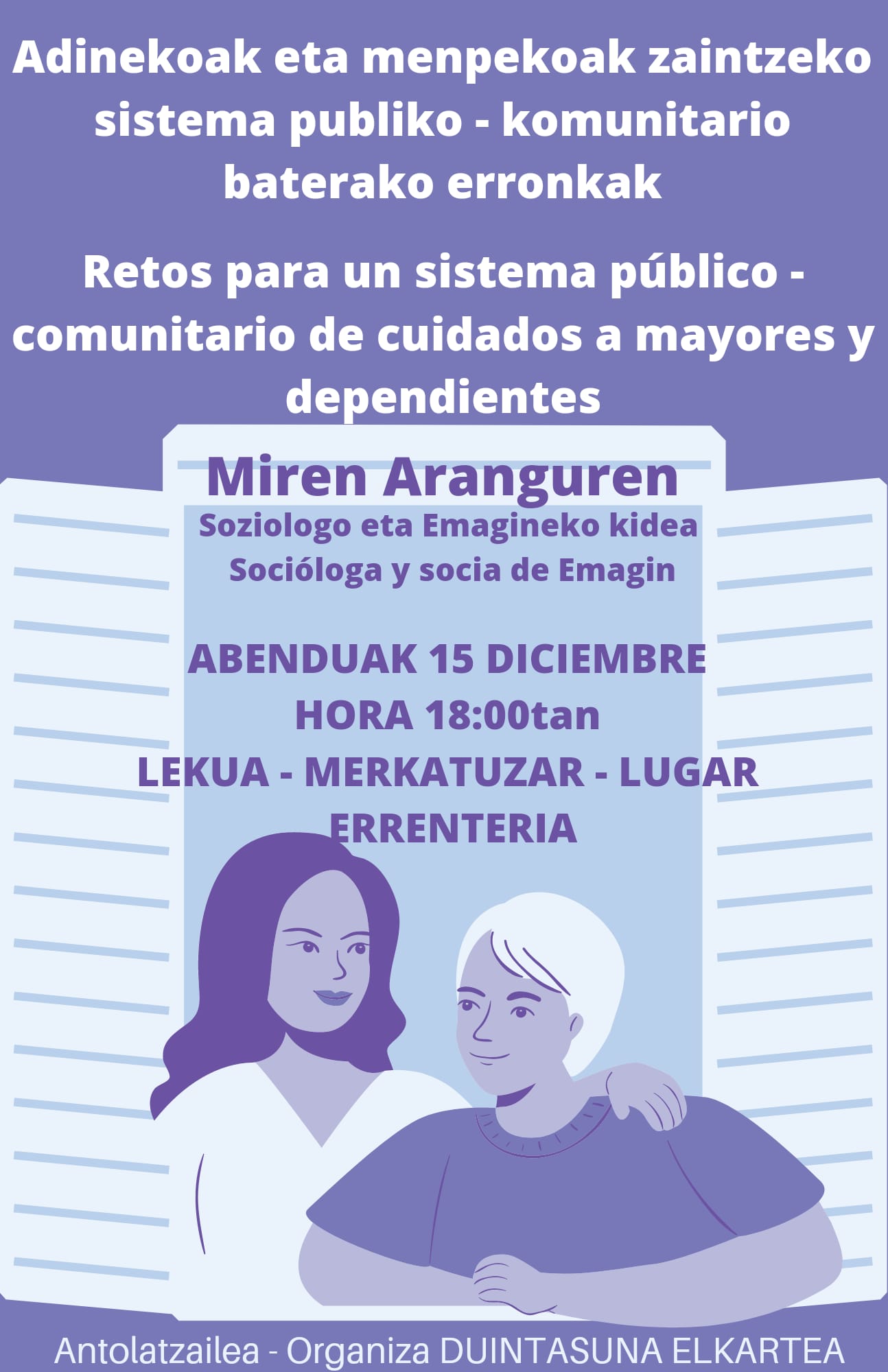 Izugarrizko poza hartu genuen Merkatu Zaharreko gela guztiz betea ikusi genuenean, eta 100 pertsona baino gehiagok zaintza lanak antolatzeko ditugun moduen gaineko hausnarketan parte hartzeko prest zeudela ikusi genuenean.Gure abiapuntua izan zen zaintza lanen dualtasuna; hots, zaintza lanak erromantizatzetik urrun, ezkutuan dituen tranpak mahai gaineratu behar dira. Zeinek egiten dituen eta zeinek jaso; zein posizio sozial duten batzuk eta besteek; zein baldintzatan egiten diren, eta zein eragin dituzten. Zaintza lanek bereizkeria egoerak sortzen dituzte, derrigorrez egiten direnean, diskriminazioak sortzen dituztenean eta jendarteko arrakalak areagotzen dituztenean, negozio pribatu direlako. Era berean, hortzimuga dira, eraldaketarako palanka; izan ere, zaintza lanen antolaketa eta ulerkera aldatzeak guztia alda dezakeelako.