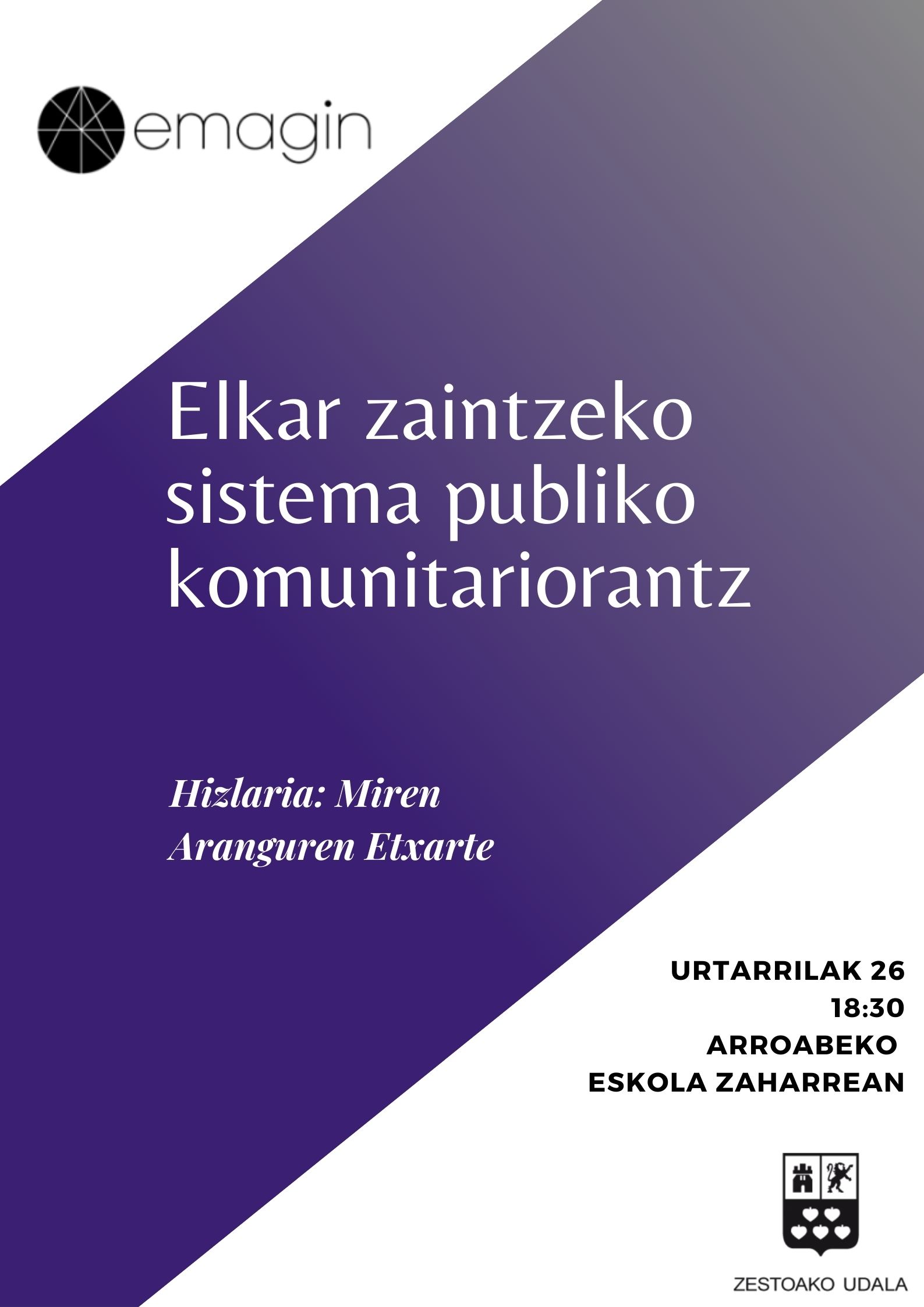 Elkar zaintzeko sistema publiko komunitariorantz 22 - 01 - 18 Urtarrilaren 26an Emaginek “Elkar zaintzeko sistema publiko komunitariorantz” hitzaldia eskainiko du Zestoako Udalak antolatuta. Arroabeko eskola zaharrean izango da, 18:30ean. Bizitza duinak erdigunera! Share this: Click to share on X (Opens in new window) X Click to share on Facebook (Opens in new window) Facebook Click to email a link to a friend (Opens in new window) Email Click to share on Telegram (Opens in new window) Telegram Click to share on WhatsApp (Opens in new window) WhatsApp Like this:Like Loading... Relacionado